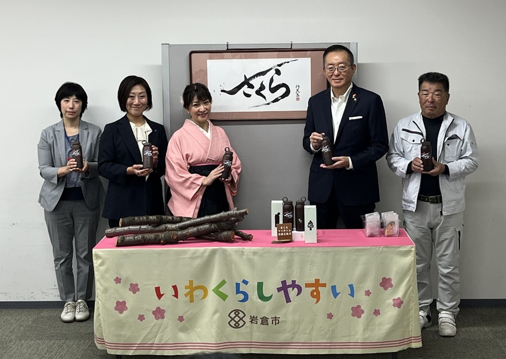 あいちサーキュラーエコノミー推進プロジェクトチーム(PT)の参画メンバーである岩倉市、アサヒユウアス株式会社と地元造園業者及び書道家の粟津紅花氏が連携し、地域のバイオマス原料を活用したバイオマスマイボトルが完成しました。2025年10月8日(水)岩倉市役所において、完成発表会が開催しました。(下写真 左から大谷真弓資源循環推進監(愛知県)、森裕佳子代表取締役(アサヒユウアス㈱)、粟津紅花氏(書道家)、久保田桂朗市長(岩倉市)、中村秀美代表取締役(中村造園土木(株))