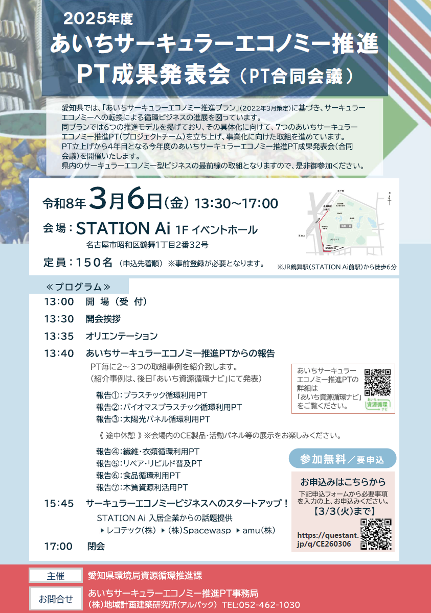 PT立上げから4年目となる今年度のあいちサーキュラーエコノミー推進PT成果発表会(合同会議)を開催いたします。